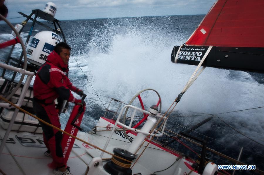 Chen Jinhao, bowman of Dongfeng Team stands beside the winch, ready to trim the mainsail during the offshore training in the Bay of Biscay, western France, on July 4, 2014. The China's Dongfeng Team prepares for Volvo Ocean Race 2014-2015 starting from Alicante of Spain in October, and it will last for nearly 9 months with 10 legs of competition over almost 39000 nautical miles (72000 km) around the world until it ends in Gothenburg of Sweden in June 2015. (Xinhua/Bu Duomen) |