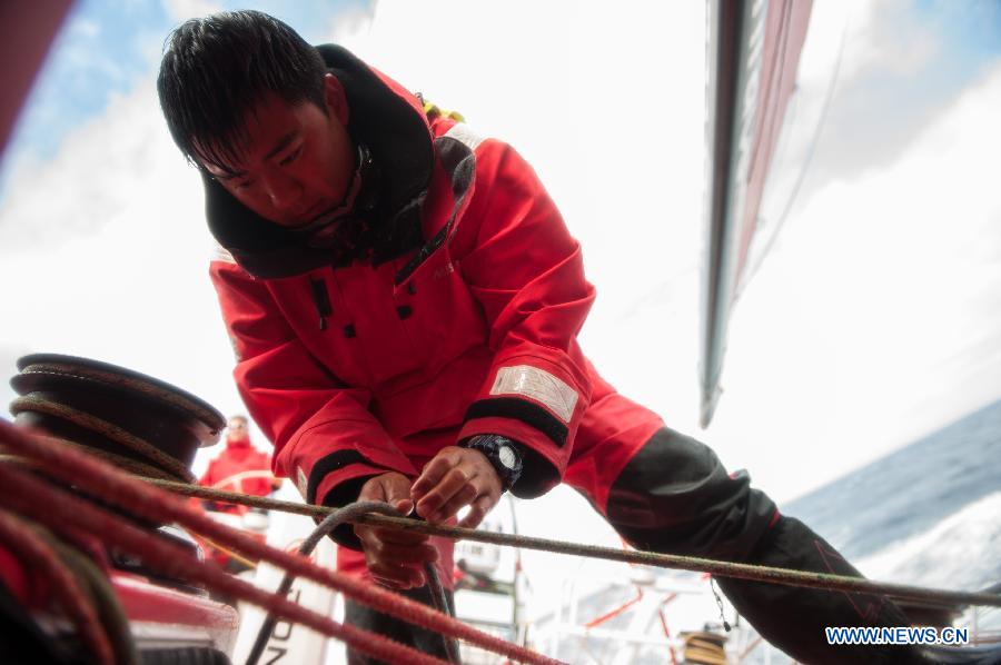 Yang Jiru, 23, pit of Dongfeng Team cleans the cord at the cockpit during the offshore training in the Bay of Biscay, western France, on July 4, 2014. The China's Dongfeng Team prepares for Volvo Ocean Race 2014-2015 starting from Alicante of Spain in October, and it will last for nearly 9 months with 10 legs of competition over almost 39000 nautical miles (72000 km) around the world until it ends in Gothenburg of Sweden in June 2015. (Xinhua/Bu Duomen) |