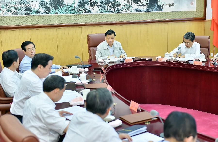 Liu Yunshan (2nd R, back), a member of the Standing Committee of the Communist Party of China Central Committee's Political Bureau, presides over a meeting concerning the Party's "mass-line" campaign in Beijing, China, July 30, 2014. (Xinhua/Li Tao) |