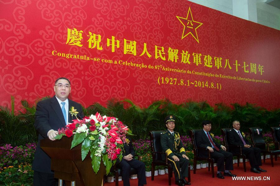 Chui Sai On (1st L), chief executive of China's Macao Special Administrative Region (SAR), addresses a reception held to celebrate the 87th anniversary of the founding of the Chinese People's Liberation Army (PLA) by the PLA Garrison in Macao, south China, July 31, 2014. (Xinhua/Cheong Kam Ka) |