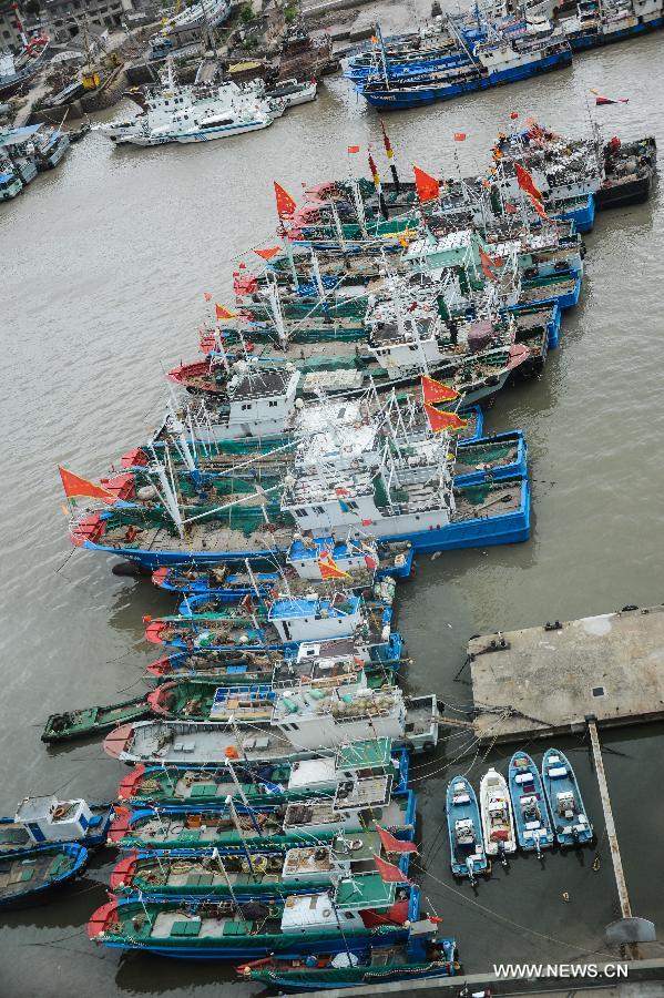 | Fishing boats are berthed in a harbor in Zhoushan, east China's Zhejiang Province, July 31, 2014. Typhoon Nakri is moving from waters southwest of Taiwan Island into the East China Sea at a speed of 20 to 25 kilometers per hour (kph), said China's National Marine Environmental Forecasting Center on Thursday. Emergency response programs have been launched by local governmental department in Zhejiang. (Xinhua/Xu Yu) |