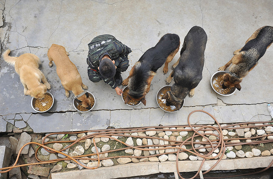 A soldier feeds his dogs on July 31, 2014. (Photo: Xinhua News Agency)