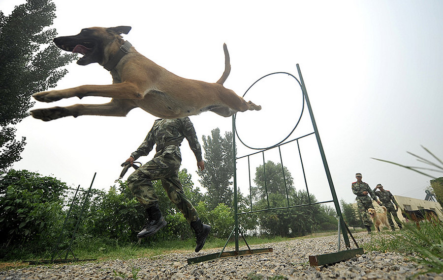 Armed police soldiers and police dogs take trainings on July 31, 2014. (Photo: Xinhua News Agency)