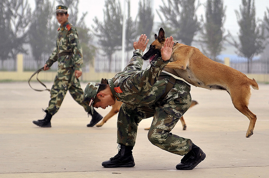 A police dog receives basic training on July 31, 2014. (Photo: Xinhua News Agency)