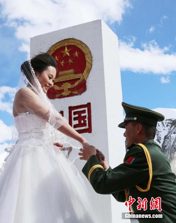 A collective wedding is held in front of the No. 7 pillar at the border between China and Pakistan in Taxkorgan, northwest China's Xinjiang on July 30, 2014. Fiver frontier soldiers and their brides swore their loves in front of the pillar on the plateau. (Photo/CNS)