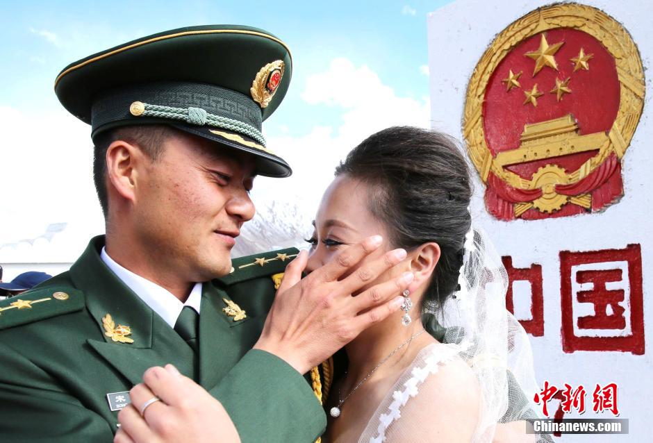 A collective wedding is held in front of the No. 7 pillar at the border between China and Pakistan in Taxkorgan, northwest China's Xinjiang on July 30, 2014. Fiver frontier soldiers and their brides swore their loves in front of the pillar on the plateau. (Photo/CNS) |