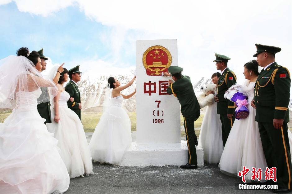 A collective wedding is held in front of the No. 7 pillar at the border between China and Pakistan in Taxkorgan, northwest China's Xinjiang on July 30, 2014. Fiver frontier soldiers and their brides swore their loves in front of the pillar on the plateau. (Photo/CNS) |