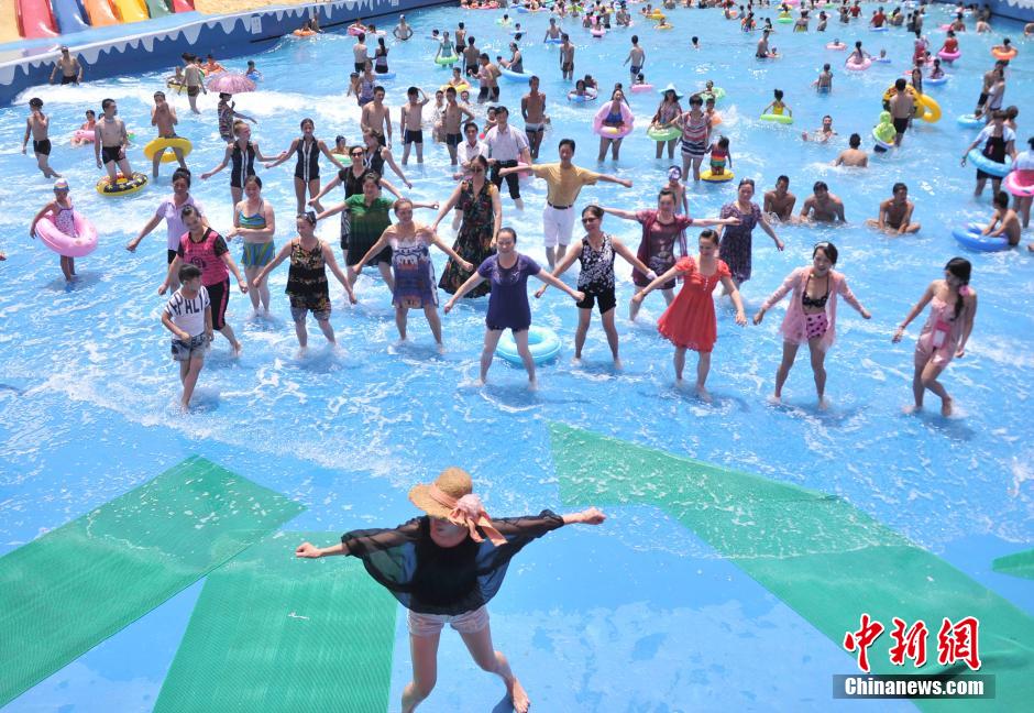 People dance to "Little Apple" in a swimming pool in SW China's Chongqing on July 30, 2014. By the Chopsticks Brothers, "Little Apple" is one of the most popular songs in China. (Photo/CNS)