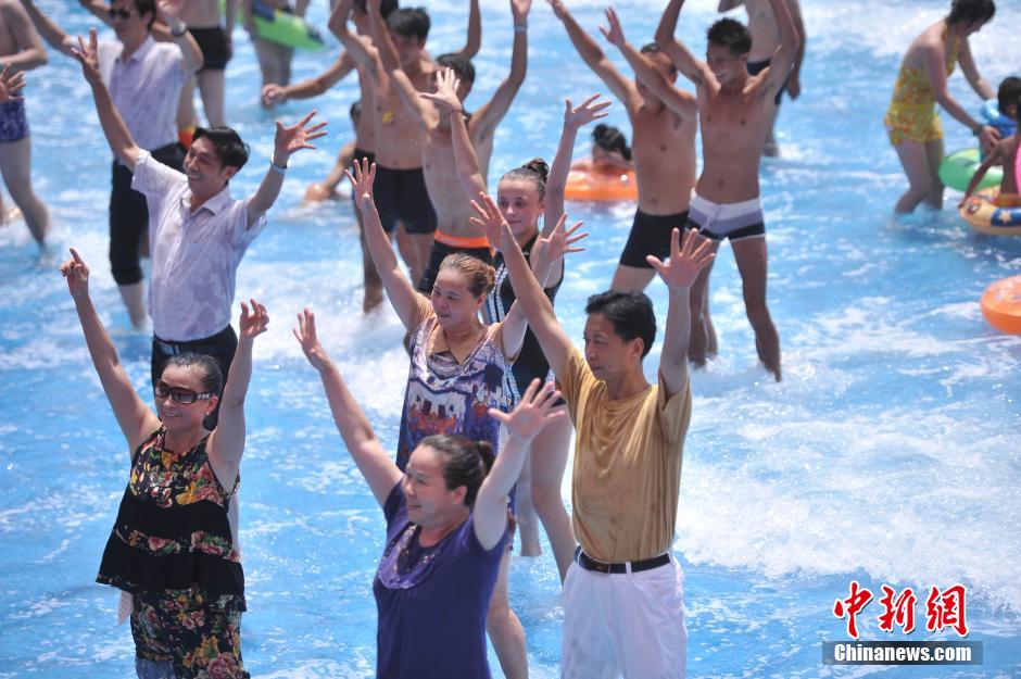 People dance to "Little Apple" in a swimming pool in SW China's Chongqing on July 30, 2014. By the Chopsticks Brothers, "Little Apple" is one of the most popular songs in China. (Photo/CNS)