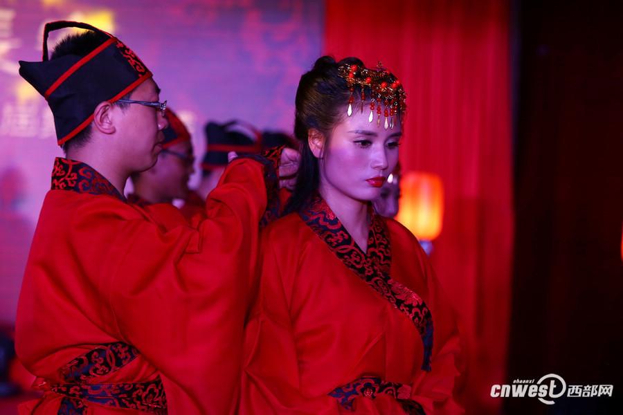 A total of 18 newlyweds attend a group wedding ceremony in Xi'an, capital of northwest China's Shaanxi province on Friday, as the "Qixi" festival approaches. They got married during the wedding wearing Han Chinese clothing, the costume of Han People in China, for the traditional service. "Qixi", marked on the seventh day of the seventh lunar month,is a traditional festival regarded as the Chinese Valentine's Day. (Cnwest Photo)