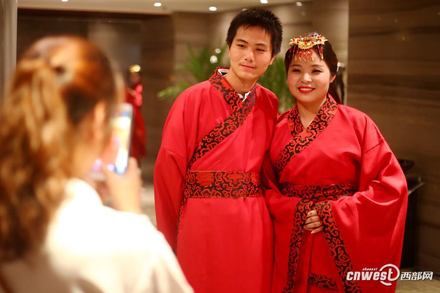 A total of 18 newlyweds attend a group wedding ceremony in Xi'an, capital of northwest China's Shaanxi province on Friday, as the "Qixi" festival approaches. They got married during the wedding wearing Han Chinese clothing, the costume of Han People in China, for the traditional service. "Qixi", marked on the seventh day of the seventh lunar month,is a traditional festival regarded as the Chinese Valentine's Day. (Cnwest Photo)