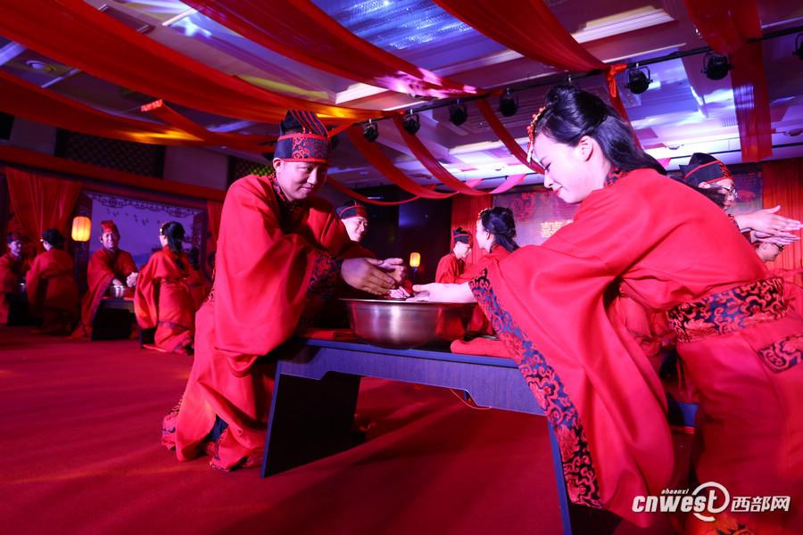 A total of 18 newlyweds attend a group wedding ceremony in Xi'an, capital of northwest China's Shaanxi province on Friday, as the "Qixi" festival approaches. They got married during the wedding wearing Han Chinese clothing, the costume of Han People in China, for the traditional service. "Qixi", marked on the seventh day of the seventh lunar month,is a traditional festival regarded as the Chinese Valentine's Day. (Cnwest Photo)