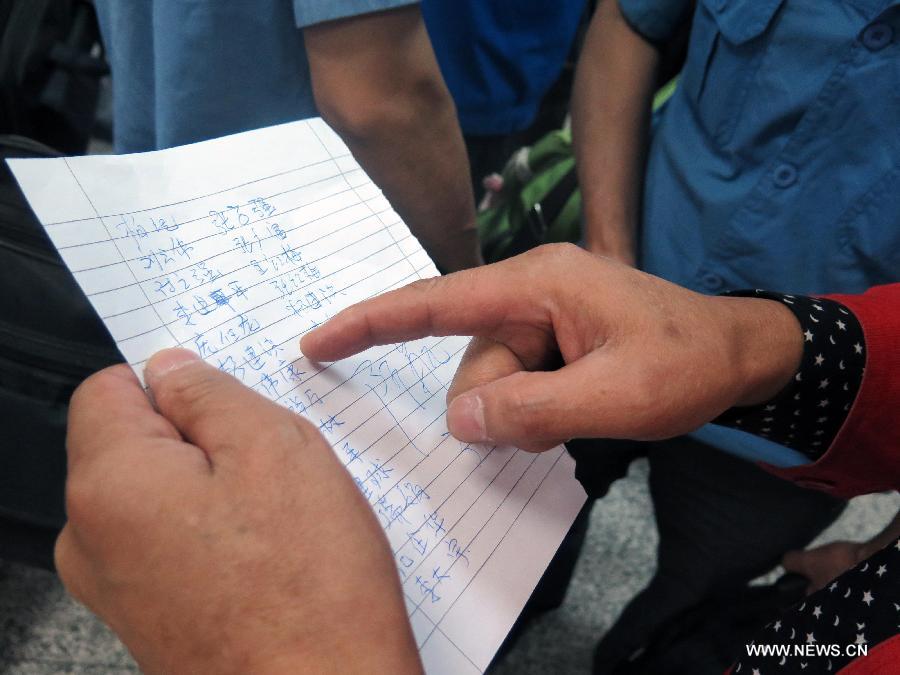 Chinese employees of a steel plant check a name list at the Carthage Airport in Tunis, Tunisia, Aug. 1, 2014. 121 Chinese nationals, who had been evacuated from violence-hit Libya, reached Tunisia early Friday, the Chinese Embassy said. They traveled to the Tunisian capital, from where they would be flown home. (Xinhua/Pan Xiaojing) |