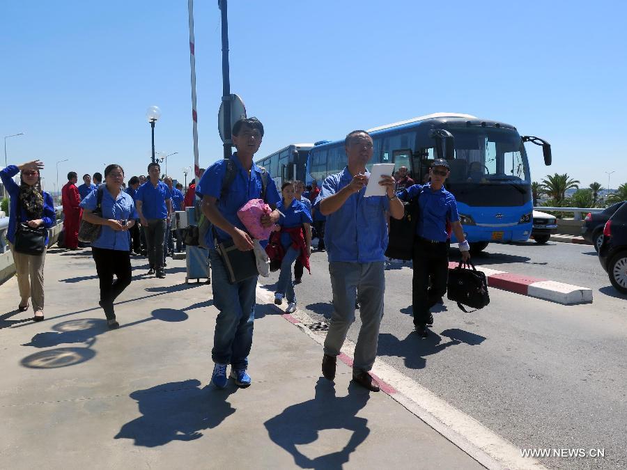 Chinese employees of a steel plant arrive at the Carthage Airport in Tunis, Tunisia, Aug. 1, 2014. 121 Chinese nationals, who had been evacuated from violence-hit Libya, reached Tunisia early Friday, the Chinese Embassy said. They traveled to the Tunisian capital, from where they would be flown home. (Xinhua/Pan Xiaojing)