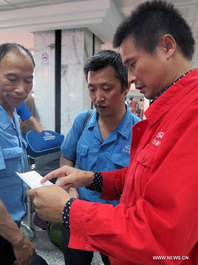 Chinese employees of a steel plant check a name list at the Carthage Airport in Tunis, Tunisia, Aug. 1, 2014. 121 Chinese nationals, who had been evacuated from violence-hit Libya, reached Tunisia early Friday, the Chinese Embassy said. They traveled to the Tunisian capital, from where they would be flown home. (Xinhua/Pan Xiaojing) |