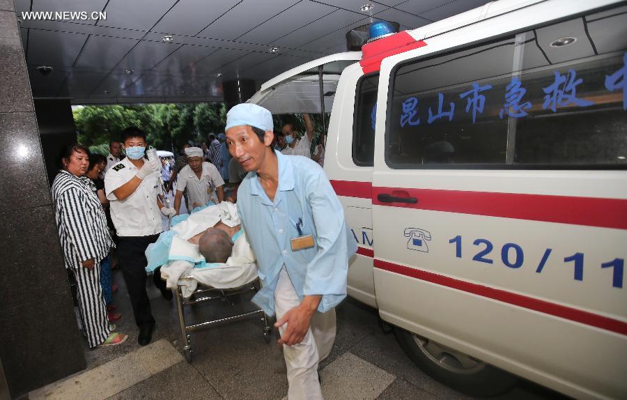 An injured victim is transferred to the Hospital Affiliated to Nantong University to receive medical treatment in Nantong, east China's Jiangsu Province, Aug. 2, 2014. An explosion has killed 69 people and injured more than 180 others after ripping through a factory in Kunshan City of Jiangsu Province on Saturday morning. (Xinhua/Ding Xiaochun) |