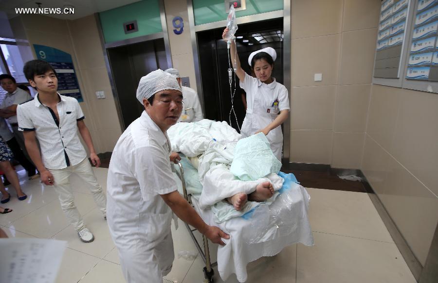 An injured victim is transferred to the Hospital Affiliated to Nantong University to receive medical treatment in Nantong, east China's Jiangsu Province, Aug. 2, 2014. An explosion has killed 69 people and injured more than 180 others after ripping through a factory in Kunshan City of Jiangsu Province on Saturday morning. (Xinhua/Ding Xiaochun)