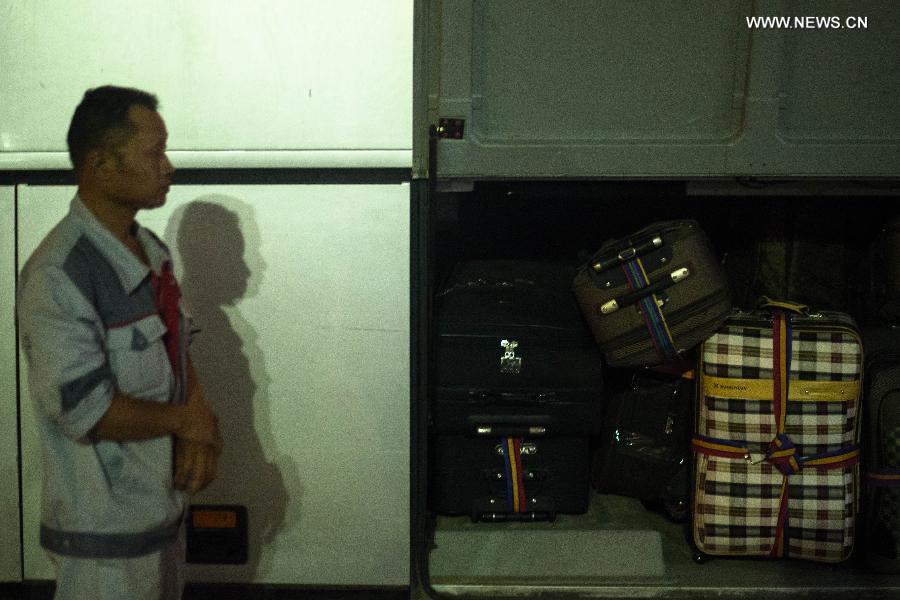 A Chinese evacuee stands by a coach at the Ras Jadir border control between Tunisia and Libya, late on Aug. 2, 2014. A total of 97 Chinese nationals, who had been evacuated from violence-hit Libya, entered Tunisia late Saturday.(Xinhua/Xu Yang)