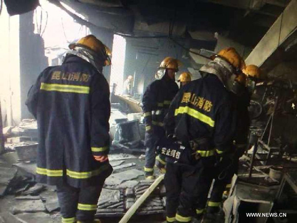 Firefighters search for survivals at the factory blast site in Kunshan, east China's Jiangsu Province, Aug. 2, 2014. A powerful factory blast has killed 65 people and injured over 100 others in Kunshan City on Saturday morning. The blast happened at around 7:37 a.m. inside a wheel hub polishing workshop owned by the Kunshan Zhongrong Metal Products Co., Ltd,. An initial probe indicated that the explosion might be caused by dusts inside the workshop, officials said. (Xinhua) |