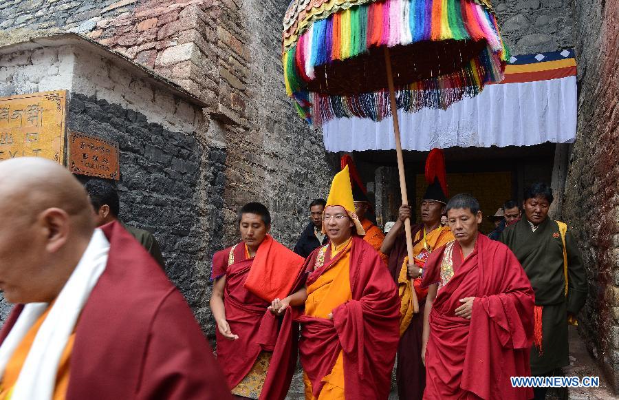 The 11th Panchen Lama Bainqen Erdini Qoigyijabu (C) walks into Sakya Monastery in Xigaze, southwest China's Tibet Autonomous Region, Aug. 2, 2014. A religious ceremony is held at Sakya Monastery, a prominent temple for Tibetan Buddhism's Sakya Sect, to celebrate the animal year of Panchen Lama Bainqen Erdini Qoigyijabu in the Chinese horoscope. There are 12 new year animals matching different lunar years in Chinese calendar, and every person takes on the animal sign of his or her birth year.(Xinhua/Chogo) |
