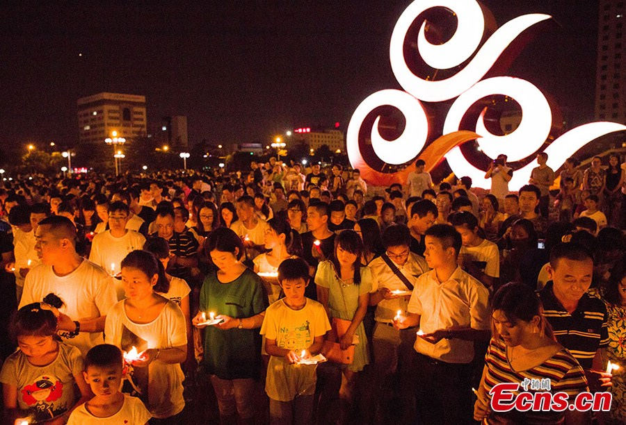 People hold candles during a candlelight vigil to mourn the victims of Saturday's factory blast in Kunshan, east China's Jiangsu Province, August 2, 2014. The blast ripped through a wheel hub-polishing workshop owned by the Taiwanese-invested Kunshan Zhongrong Metal Products Co., Ltd in the city at 7:37 am on Saturday, killing at least 69 people and injuring more than 180 others. (Photo: China News Service/Li Ji) |