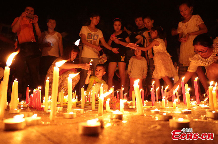 A candlelight vigil is held to mourn the victims of Saturday's factory blast in Kunshan, east China's Jiangsu Province, August 2, 2014. The blast ripped through a wheel hub-polishing workshop owned by the Taiwanese-invested Kunshan Zhongrong Metal Products Co., Ltd in the city at 7:37 am on Saturday, killing at least 69 people and injuring more than 180 others. (Photo: China News Service/Li Ji)