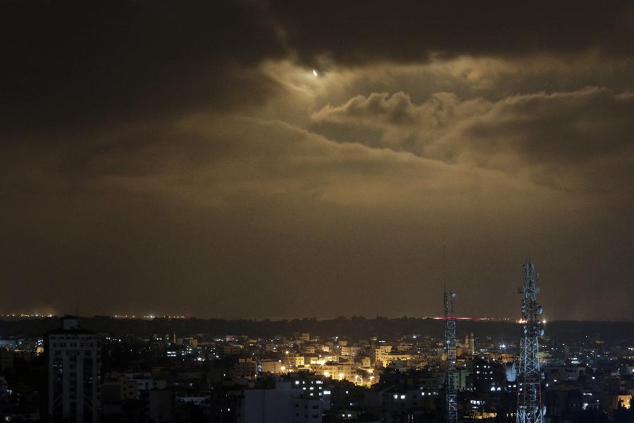 In this slow exposure photo, flares light the sky over Gaza as a trace of Israeli shelling, bottom right, is seen from Gaza City, in the northern Gaza Strip, July 28, 2014. A truce between Israel and Hamas militants in Gaza remained elusive as diplomats sought to end the fighting at the start of the Eid al-Fitr holiday, marking the end of the Muslim holy month of Ramadan. (Xinhua/AP Photo) |