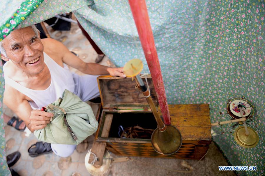 Puppeteer Xiao Qiulin displays the "magic box" for his puppet show performing in Yudu County, east China's Jiangxi Province, Aug. 1, 2014. Xiao, 65, started making a living by performing puppet shows for local residents since his twenties. With a stage enclosed by a piece of cloth, a set of instruments and several puppets, Xiao could perform a show for his audience all by himself. Now Xiao has recruited several apprentices, hoping that one day he could build a puppet troupe and his craftsmanship could be carried forward. (Xinhua/Chen Zixia) |