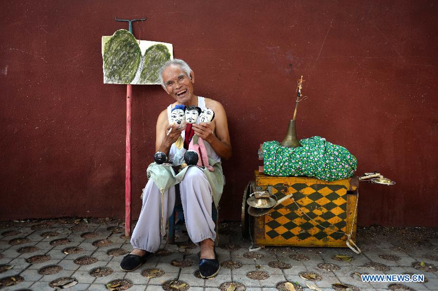Photo taken on Aug. 1 , 2014 shows puppeteer Xiao Qiulin and his show equipments in Yudu County, east China's Jiangxi Province. Xiao, 65, started making a living by performing puppet shows for local residents since his twenties. With a stage enclosed by a piece of cloth, a set of instruments and several puppets, Xiao could perform a show for his audience all by himself. Now Xiao has recruited several apprentices, hoping that one day he could build a puppet troupe and his craftsmanship could be carried forward. (Xinhua/Chen Zixia) |