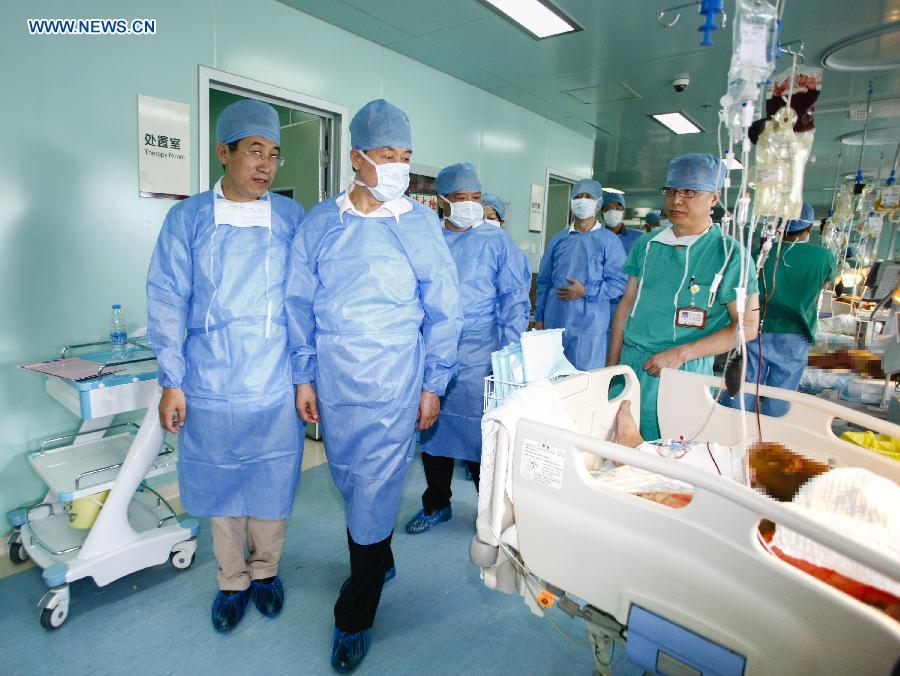 Chinese State Councilor Wang Yong (2nd L) visits people injured in a blast accident at the Third People's Hospital in Wuxi City, east China's Jiangsu Province, Aug. 3, 2014. A powerful factory blast has killed 69 people and injured over 180 others in Kunshan on Saturday morning. The injured have been treated in hospitals in Kunshan and the nearby cities of Suzhou, Wuxi and Shanghai. Wang visited victims of the accident and medical staff members at hospitals in Wuxi, Changzhou and Nantong on Sunday. (Xinhua/Chen Yichen) |