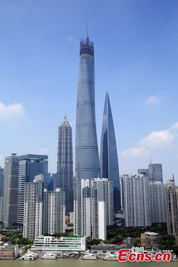 The final steel beam was installed on Shanghai's tallest building on Sunday, August 3, 2014, with the skyscraper reaching is designed height of 632 meters. The 137-story Shanghai Tower in Lujiazui financial and trade zone in the city's Pudong New Area is expected to open in the middle of next year. The landmark building will include offices, commercial space, a five-star hotel, exhibition and conference halls and recreational facilities. (China News Service/Pan Suofei)