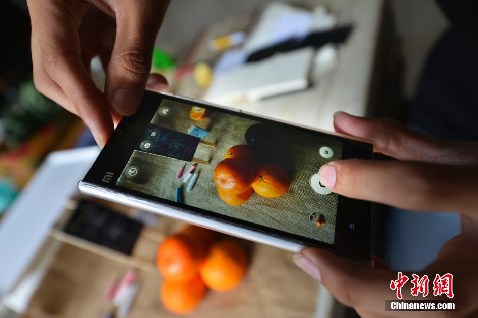 Zhao takes pictures of his fruits in Zouping county, east China's Shandong province, July 29, 2014. (CNS Photo)
