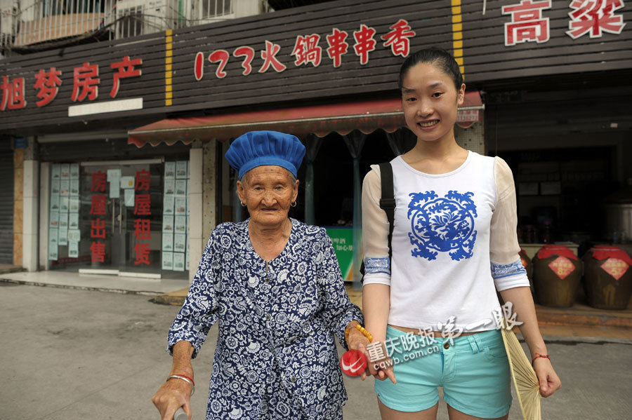 Huang Lihua, a post-90s girl, goes to work with her 88-year-old grandma, July 17, 2014. (Photo/cqwb.com.cn)