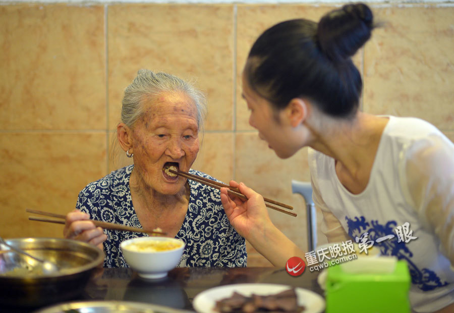 Huang feeds her grandma. (Photo/cqwb.com.cn)