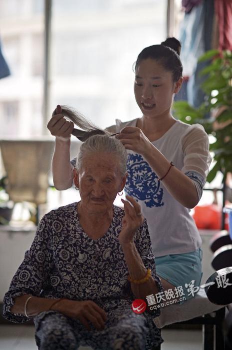 Huang ties her grandma's hair up. (Photo/cqwb.com.cn)