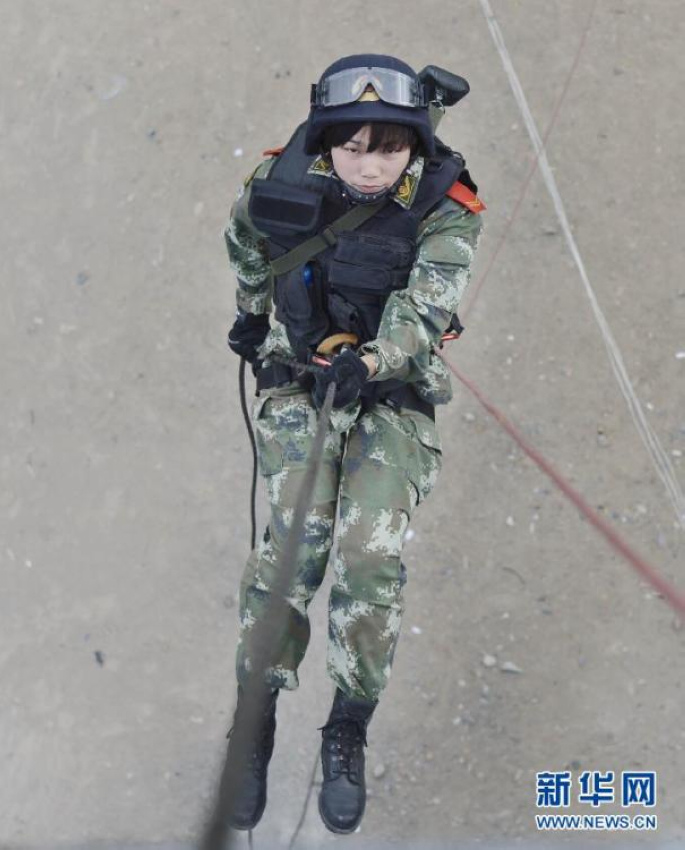 Hong Jiajia conducts armed rope descending training on July 29, 2014. (Xinhua)