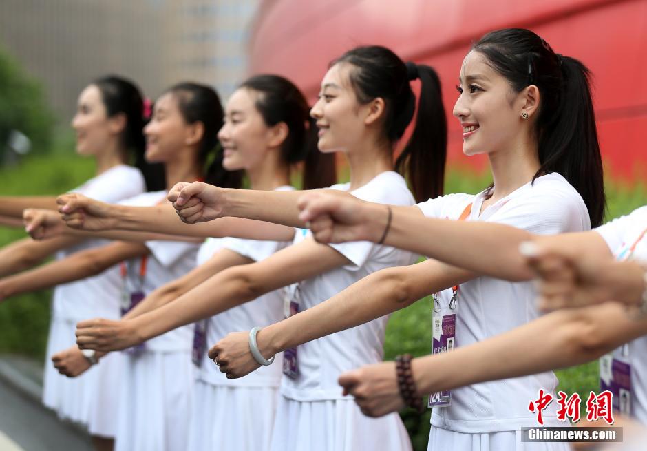 Braving the scorching heat, 205 guides selected from local universities and high schools devote themselves to the training for the opening and closing ceremonies of the 2nd Youth Olympic Games at the Olympic Sports Centre in Nanjing on August 1, 2014. (CNS/Yang Bo) |