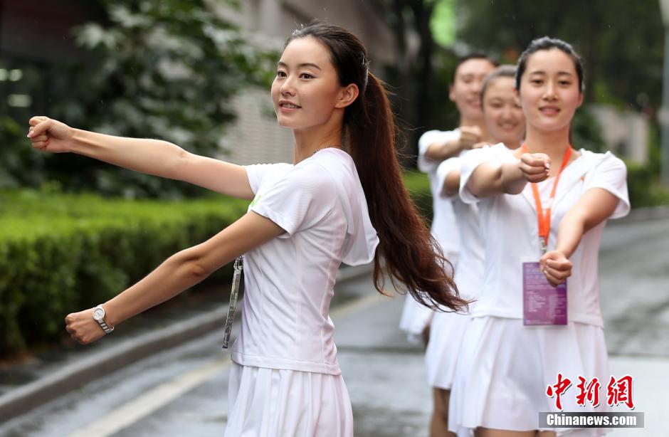 Braving the scorching heat, 205 guides selected from local universities and high schools devote themselves to the training for the opening and closing ceremonies of the 2nd Youth Olympic Games at the Olympic Sports Centre in Nanjing on August 1, 2014. (CNS/Yang Bo)