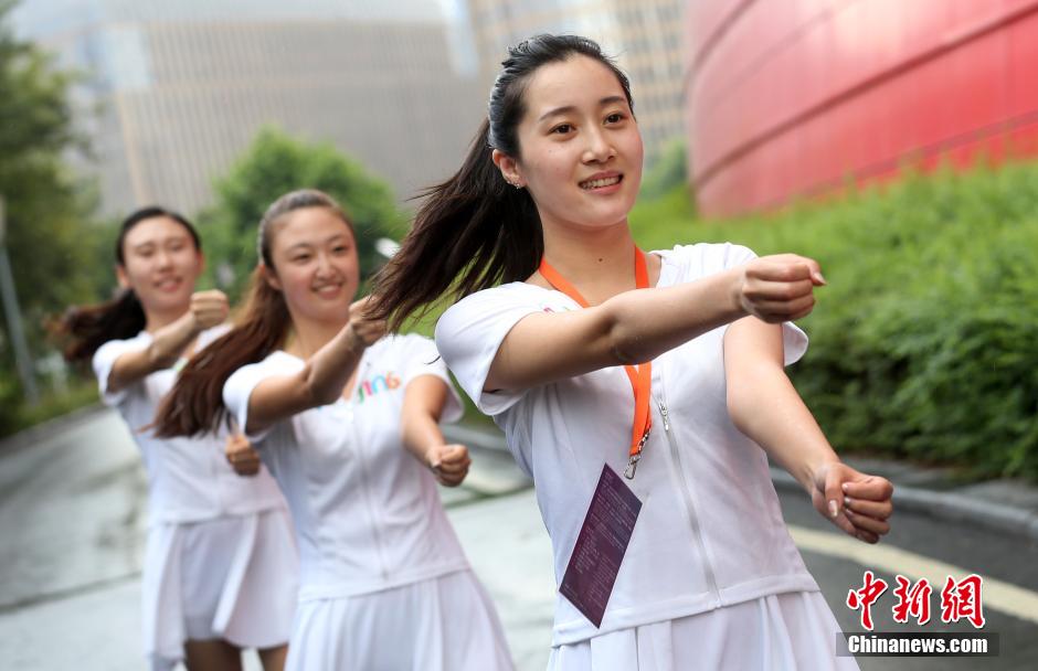 Braving the scorching heat, 205 guides selected from local universities and high schools devote themselves to the training for the opening and closing ceremonies of the 2nd Youth Olympic Games at the Olympic Sports Centre in Nanjing on August 1, 2014. (CNS/Yang Bo) |