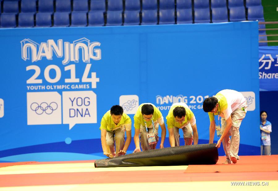 Volunteers practise laying a carpet during the volunteer training for the 2nd Summer Youth Olympic Games at Longjiang Gymnasium in Nanjing, China on Aug. 4, 2014. Volunteers for protocol, spectator services, broadcast and material management are receiving intensified practical training for the upcoming Youth Olympic Games in Nanjing. (Xinhua/Sun Can) |