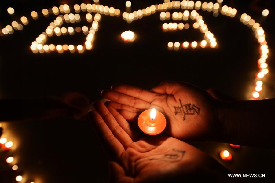 Residents light candles, praying for Ludian earthquake stricken area, in Guangling District in Yangzhou, east China's Jiangsu Province, Aug. 4, 2014. (Xinhua/Meng Delong)