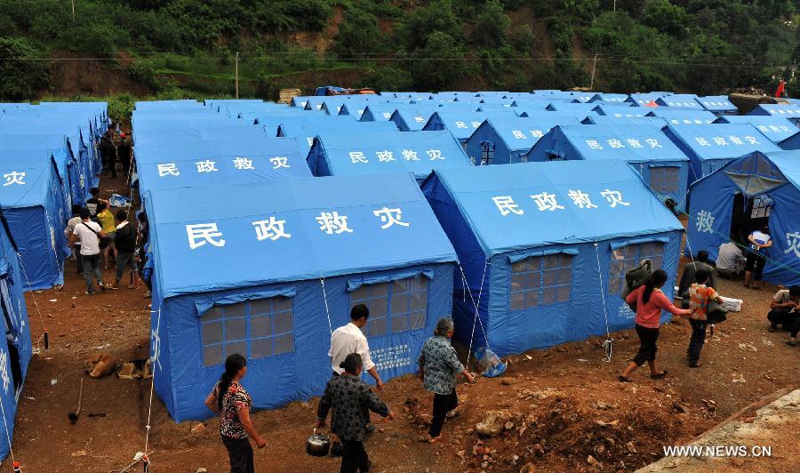 The affected residents move into the temporary tents in Longtoushan township of Ludian county, southwest China's Yunnan Province, Aug. 4, 2014. At least 398 people have been killed after a 6.5-magnitude earthquake rattled the province Sunday afternoon. (Xinhua/Chen Haining) |