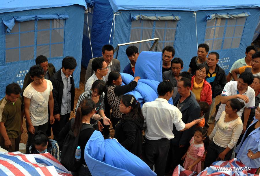 Members of civil administration department deliver quilts to the affected residents after an earthquake in Longtoushan township of Ludian county, southwest China's Yunnan Province, Aug. 4, 2014. At least 398 people have been killed after a 6.5-magnitude earthquake rattled the province Sunday afternoon. (Xinhua/Chen Haining) |
