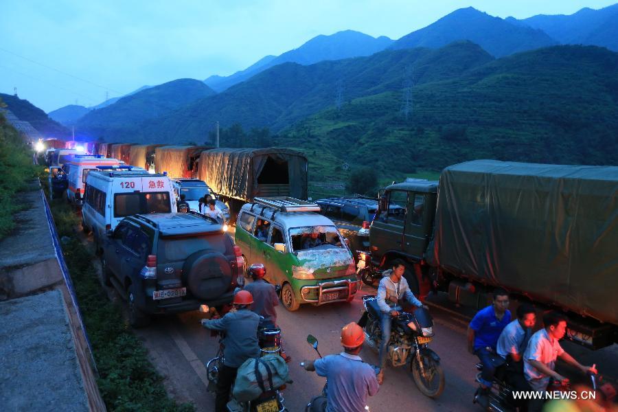 Vehicles and pedestrians move out of the quake-stricken area in Longtoushan township of Ludian county, southwest China's Yunnan Province, Aug. 4, 2014. At least 398 people have been killed after a 6.5-magnitude earthquake rattled the province Sunday afternoon. (Xinhua/Xing Guangli) |