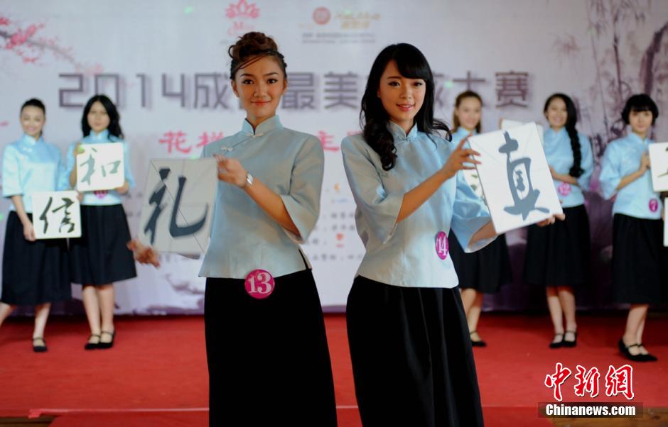 Girls display the beauty of Qipao (Mandarin Gown) and school uniforms with special features during the 2014 Chengdu Most Beautiful Contest with the blooming years as the theme in Chengdu, southwest China’s Sichuan province, August 2, 2014.(Chinanews.com/ Ye Jian) |