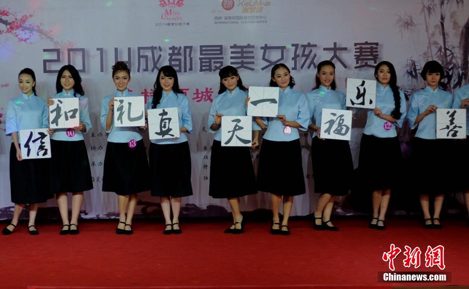 Girls display the beauty of Qipao (Mandarin Gown) and school uniforms with special features during the 2014 Chengdu Most Beautiful Contest with the blooming years as the theme in Chengdu, southwest China’s Sichuan province, August 2, 2014.(Chinanews.com/ Ye Jian) |