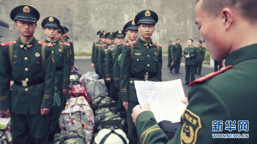 Shapingbei fire squadron recruits 14 new soldiers including Chen Jihang on March 2, 2013. (Xinhua/Wang Xin)