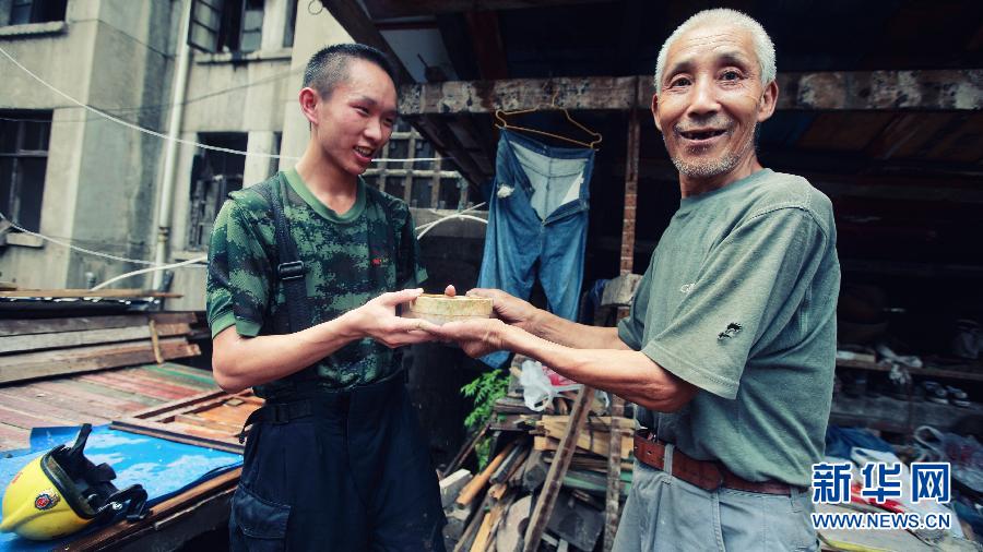 An old man serves Chen Jihang with water after Chen puts out a fire. (Xinhua/Wang Xin)