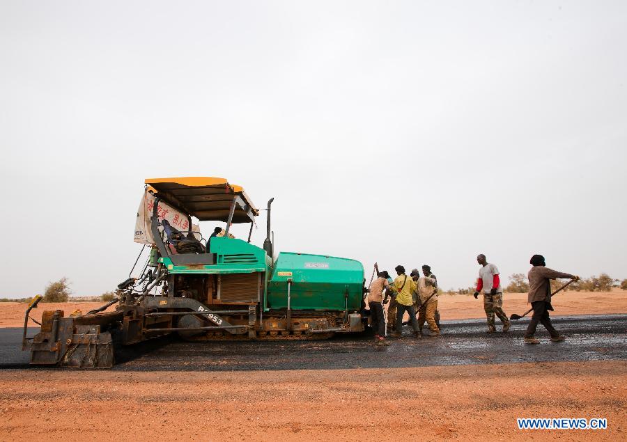 Local employees work at the road constructaion site in the Brakna Region, southern Mauritania, Aug. 4, 2014. The 172km road which connects regions of Aleg, Kiffa, Assaba and Brakna, all located in Western Sahara, belongs to one of the China's assistance constructions in the northwest African country. (Xinhua/Li Jing) |
