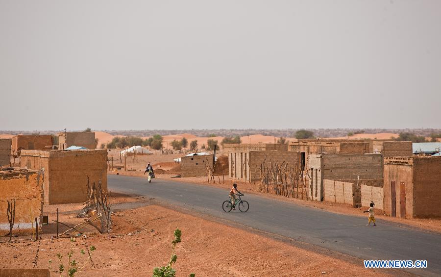 Local villagers walk on the road constructed by China in Mal Town, the Brakna Region, southern Mauritania, Aug. 4, 2014. The 172km road which connects regions of Aleg, Kiffa, Assaba and Brakna, all located in Western Sahara, belongs to one of the China's assistance constructions in the northwest African country. (Xinhua/Li Jing) |